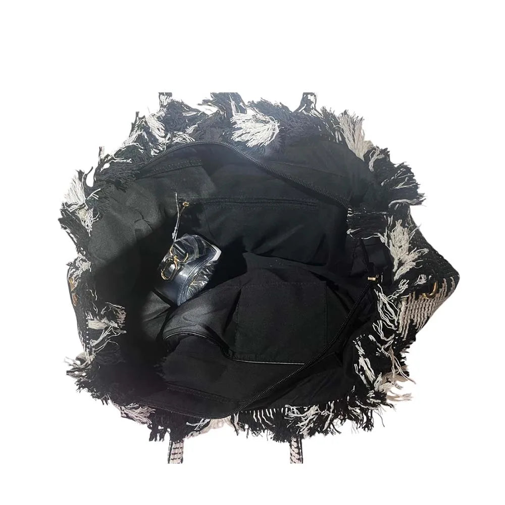 Borsa mare donna con frange Borsa mare donna sfrangiata in tessuto con doppi manici e tracolla larga in ecopelle non regolabile ma removibile. Internamente ha 3 tasche di cui una con zip.