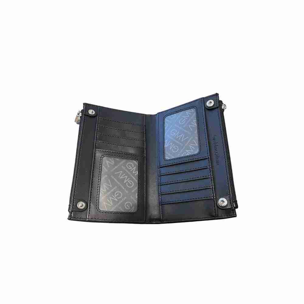 Portafoglio donna Gianmarco Venturi Portafoglio Gianmarco Venturi in ecopelle. Il portafoglio dotato di un logo in acciaio sulla parte frontale. Apertura con bottone con vari comparti per le carte e lateralmente troviamo due tasche con zip.