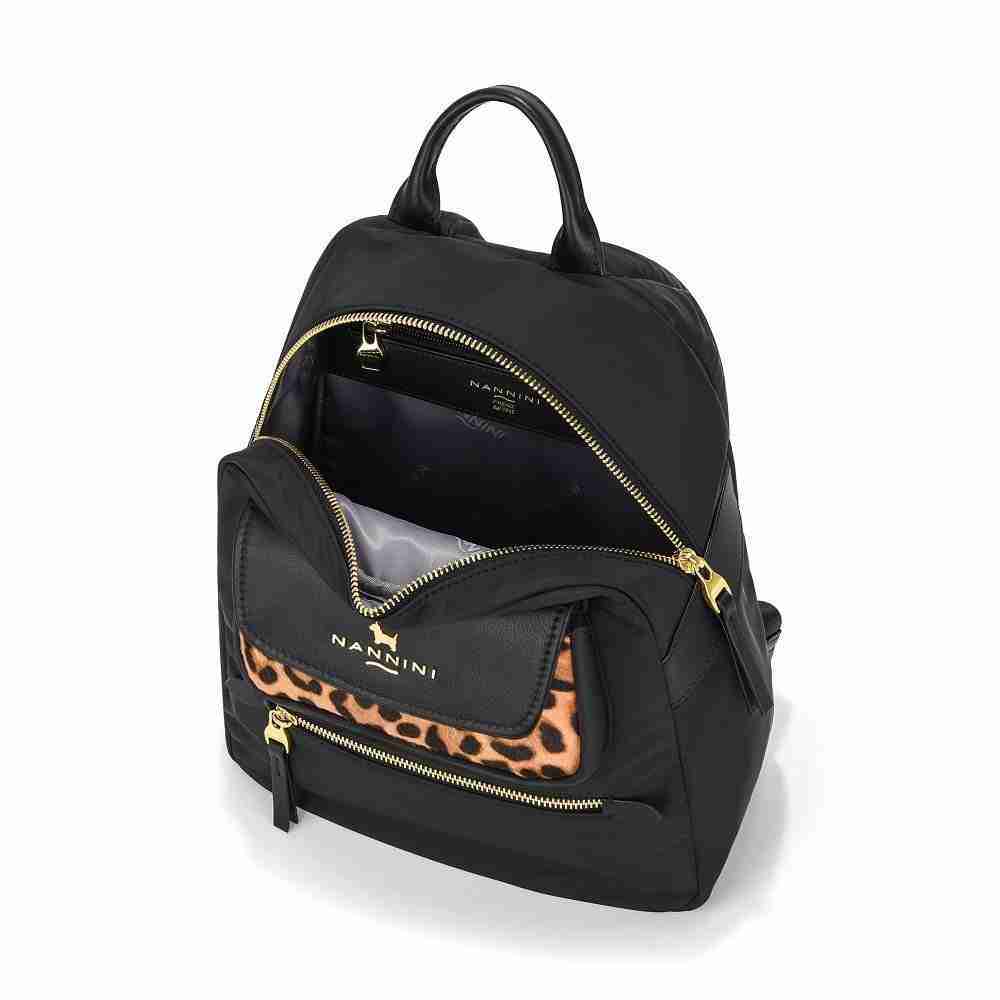 Zaino donna Nannini Aliza Zaino Nannini Aliza in nylon e vera pelle. Lo zaino presenta il logo dorato sulla parte frontale, un taschino con zip e uno con clip, un manico superiore e spallacci regolabili. La chiusura con zip nasconde un unico scomparto con all interno un taschino con zip.